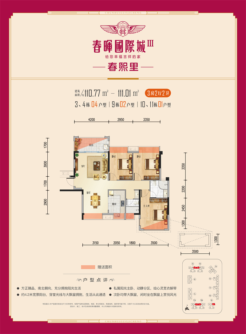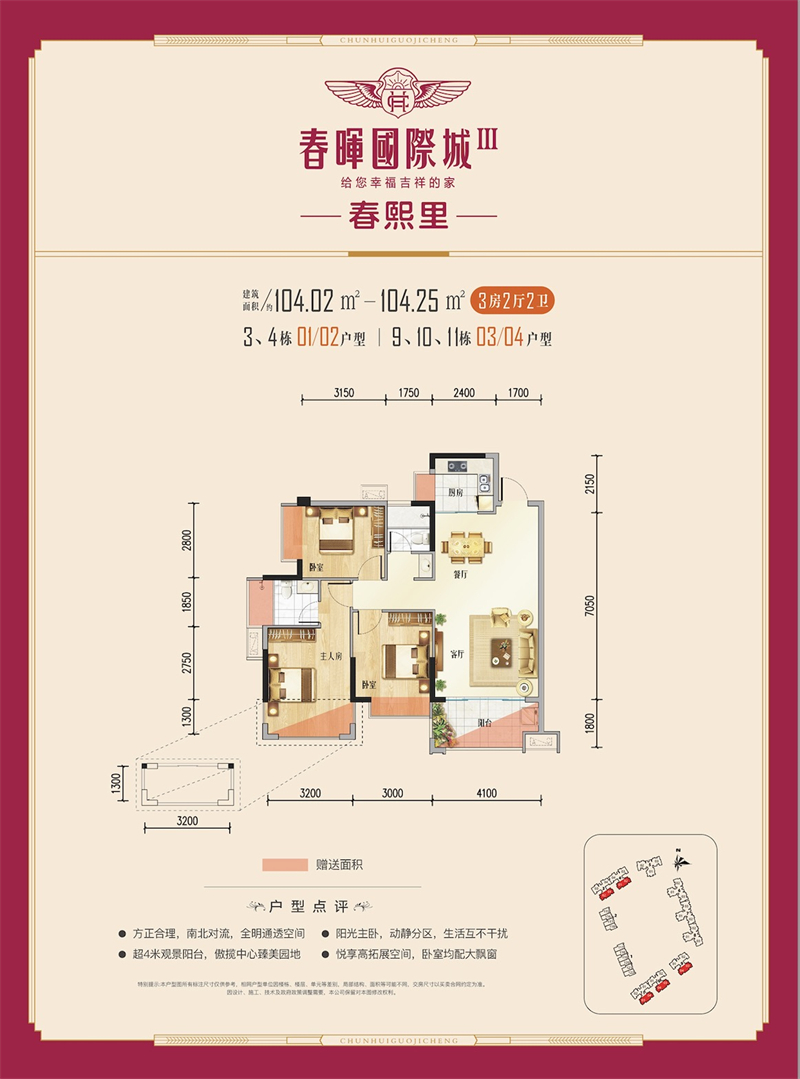 2、超高赠送、超高得房,104平刚需户型即享4.1客厅开间,真正刚需即改善尺度享受;