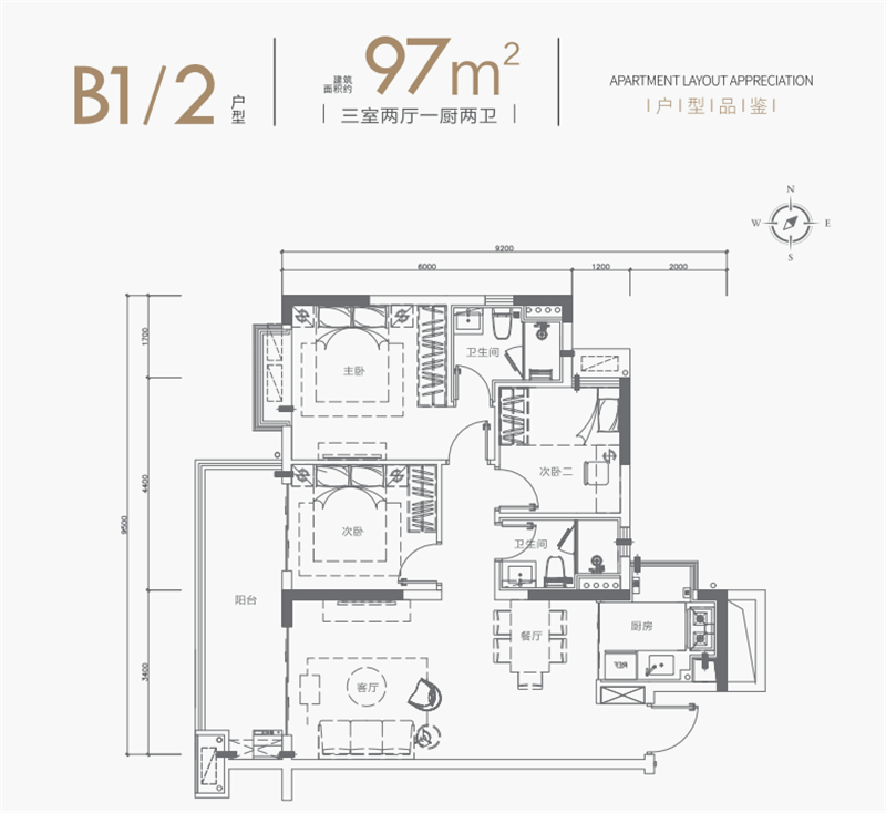 • B1/2户型:约95/97㎡三房两厅两卫