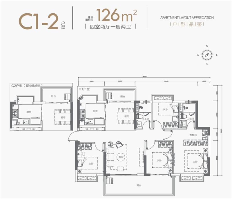 • C1-2户型:约126㎡四房两厅两卫