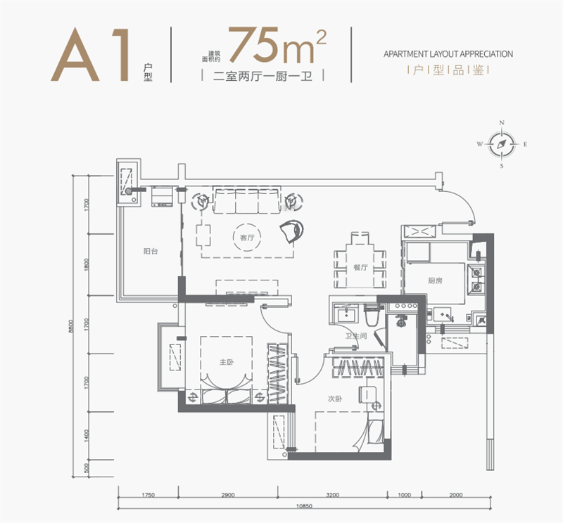 • A1户型:约75㎡两房两厅一卫