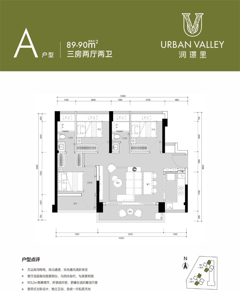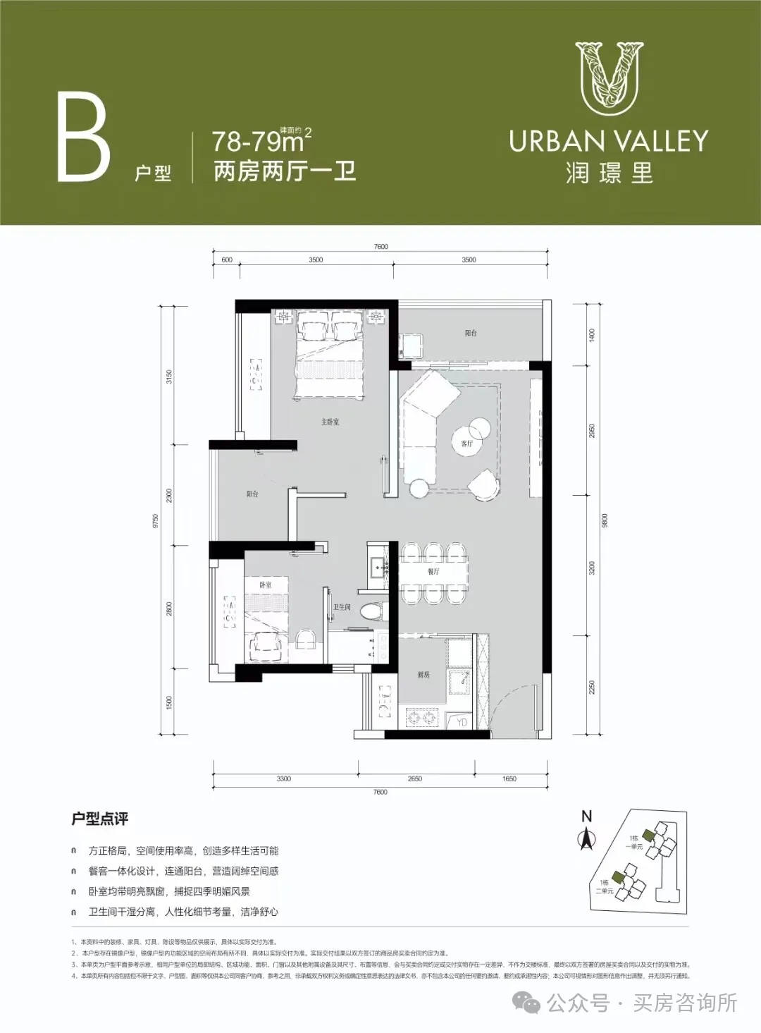 双阳台设计,南北通透,动静分区,约3.8m舒适客厅开间尺度