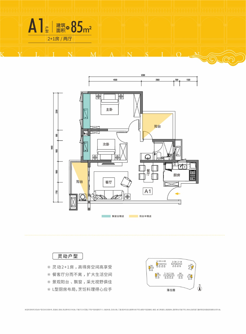 • A1户型:建面约85㎡,2+1房2厅1卫