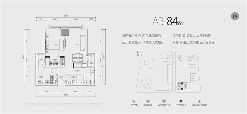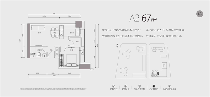 本期推售的约67-87㎡1-2房,均位于29层之上高区,享百米以上景观。70年产权,户户带阳台,拥有3.3m超舒适层高。室内公区、样板房均由CCD香港郑中设计事务所设计,将高级定制融入每一寸居住空间。