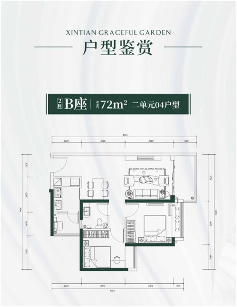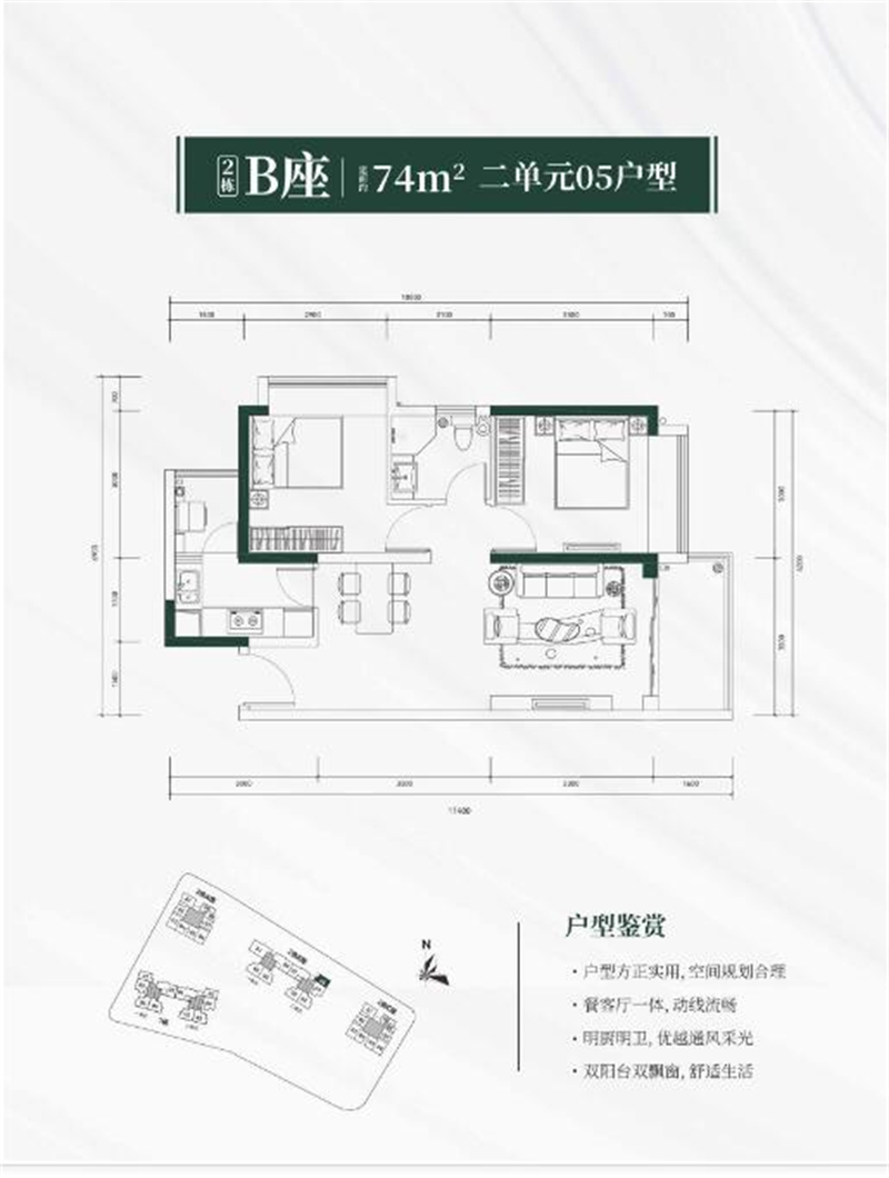 2栋B座二单元04、05户型:面积约为72-74㎡的2房2厅1卫。
