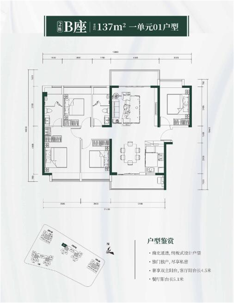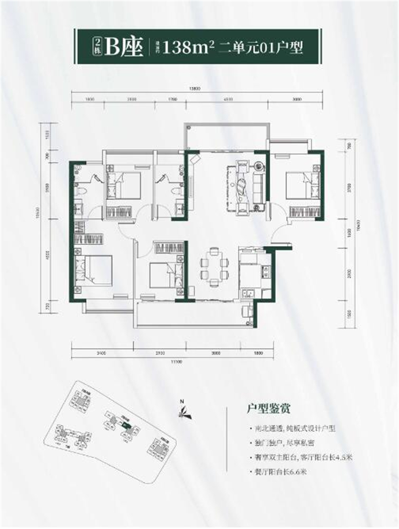 2栋B座一单元01、04户型、2栋B座二单元01户型:面积约为137-138㎡的4房2厅2卫;