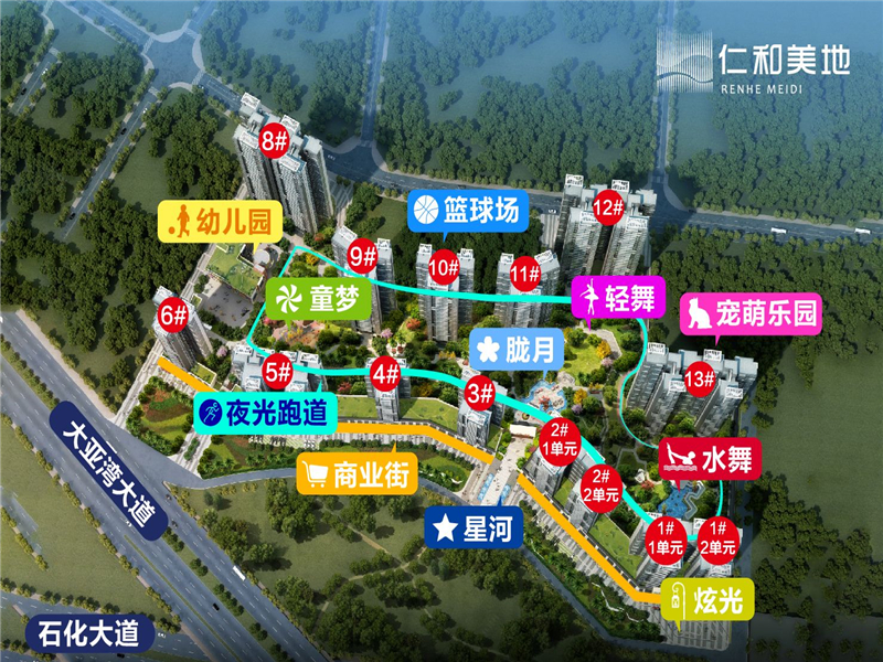仁和美地位于大亚湾东西及南北两条主干道——石化大道与大亚湾大道交汇处东北角,距离惠深沿海高速澳头收费站西侧约800,距离厦深高铁惠州南站实际车程约为6.7(驾车约需20),距离万达广场实际车程2.8(驾车约需10)。周边为成熟的居住区,建有多个已入住及在建在售商品房项目,如峰景湾、星河半岛、凯悦春天、新力琥珀园等,东侧几就是“大亚湾高新区”——大亚湾科技创新园,设有大亚湾区政务服务中心。总体而言,项目所处的地段位大亚湾区中心商圈地段,交通便利。