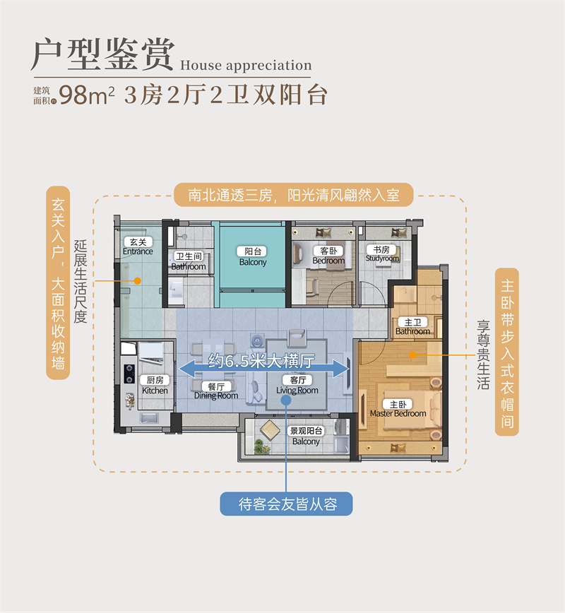 约77-98㎡ 2-3房+双阳台,人性化贴心设计,使用率超90%,功能性与实用性完美平衡。