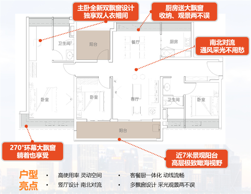 ④大尺度套间主卧,270°环幕大飘窗,尊崇自显;