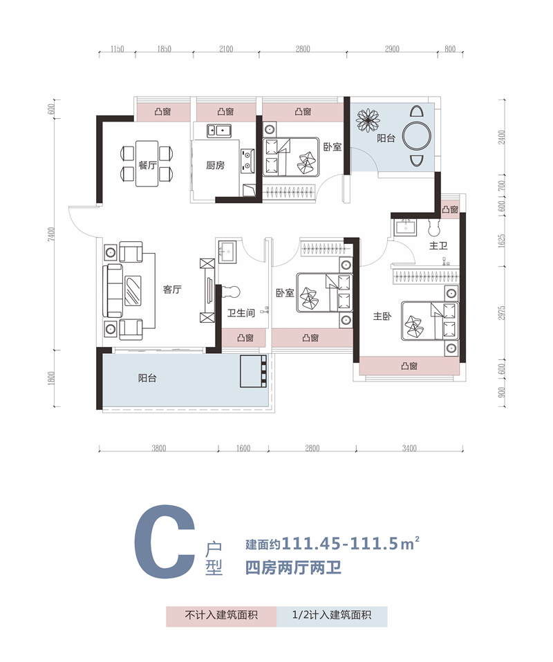 C户型:111.5㎡ 3+1房2厅2卫赠送面积:约17.55㎡(15.7% )??户型落位:1-1-02户|户型方正,南北通透,全明采光型|景观阳台与餐客厅无缝连接,举步揽园景品|约3.8m客厅大开间,5.4超宽阳台鉴|多功能房设计,创意百变,舒适随心