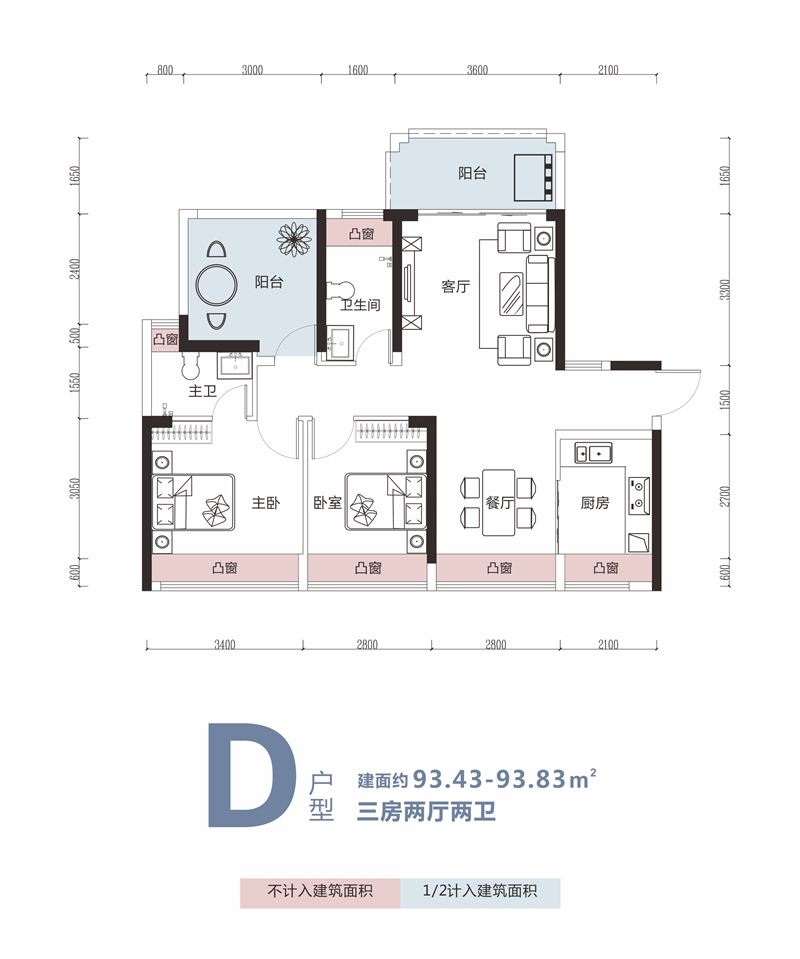 ??D户型:约93.83㎡ 2+1房2厅2卫赠送面积:约15.34㎡(16.4% )??户型落位:1-2-01、2-2-01户|户型方正,南北通透, 全明采光型|超大景观阳台,尽揽园林美景品|约3.6m客厅大开间,待客阔达从容鉴|超大阳台赠送,可改一房,百变空间