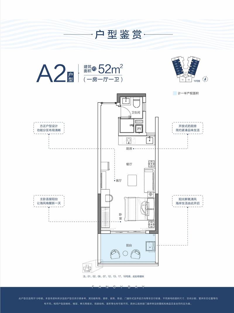 【优质户型 滨海无忧资产】【A2户型】 建筑面积约52㎡,一房一厅一卫