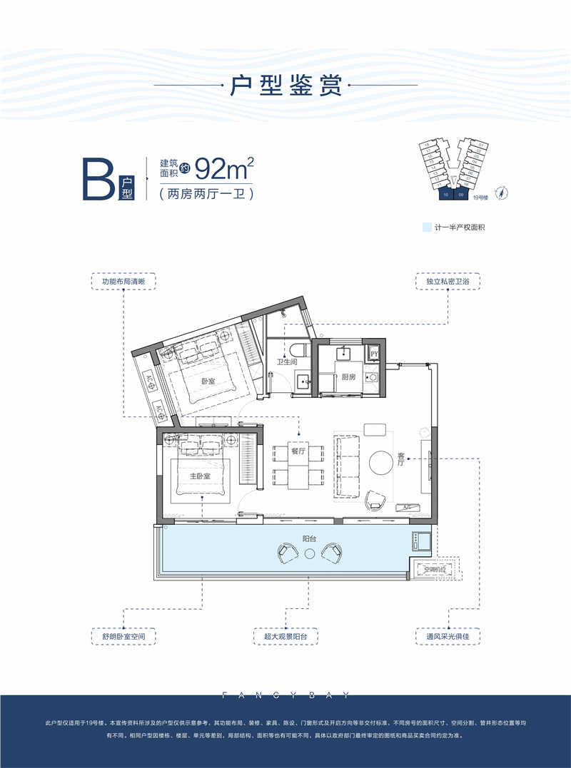 【B户型】 建筑面积约92㎡,两房两厅一卫