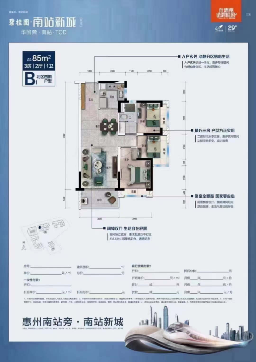 【碧桂园·南站新城天元B户型】建筑面积约103~104㎡,三房两厅两卫