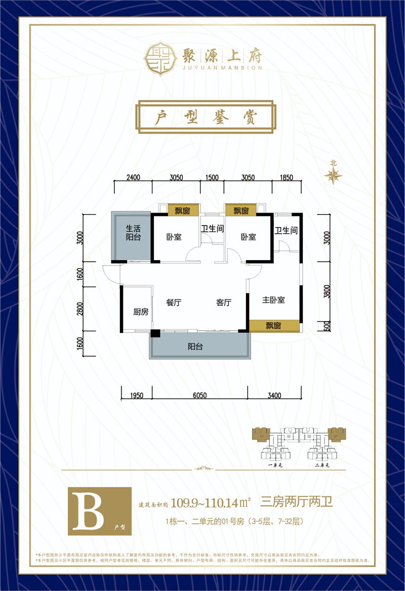 B户型:建筑面积约109.9~110.14㎡(三房两厅两卫)· 户户朝南,使用率高,满足生活需求· 两大阳台,采光通风俱佳,