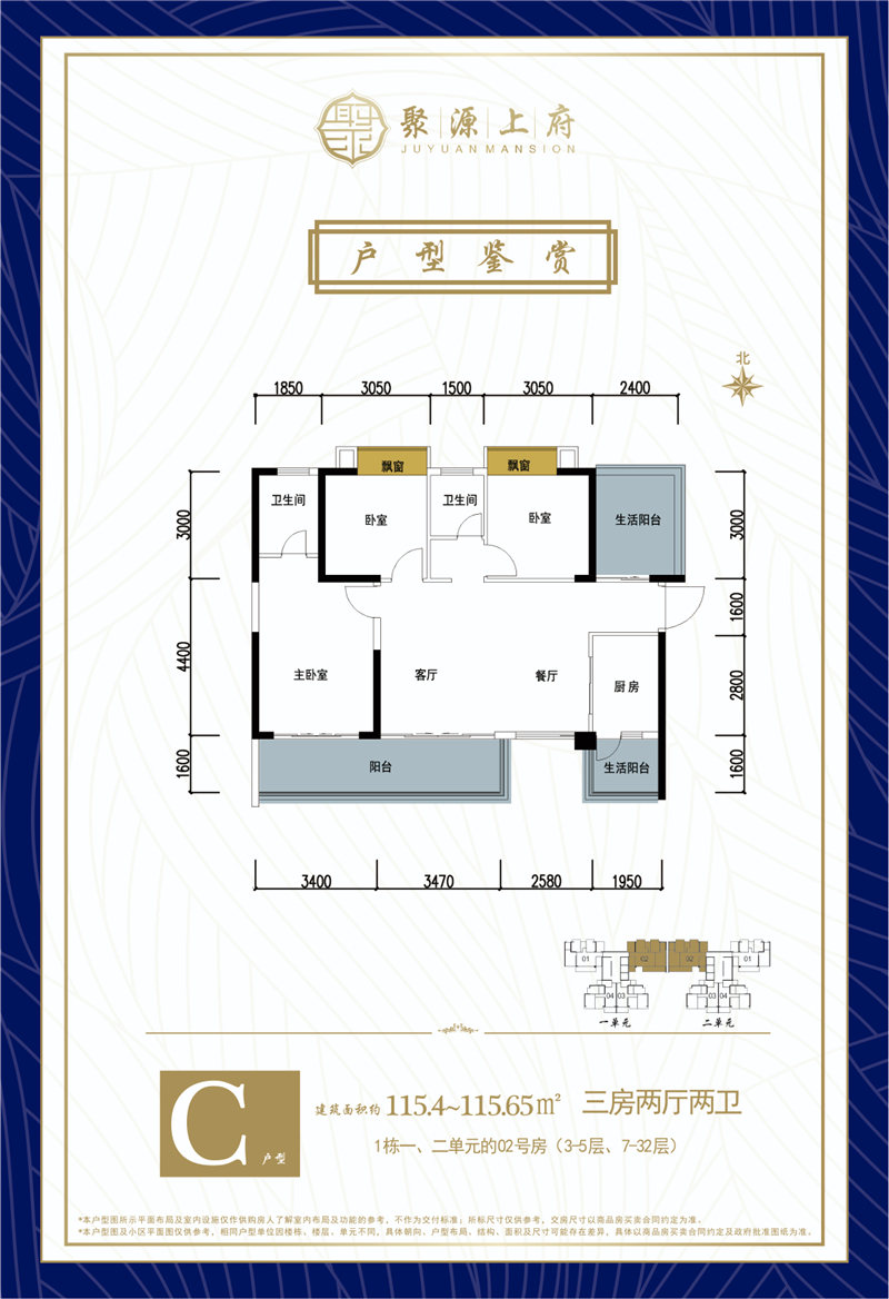C户型:建筑面积约115.4-115.65㎡(三房两厅两卫)· 户型南北通透,合理设计,科学布局· 独立厨房,通风采光俱佳,干湿分离,方便使用,更温馨舒适· 超大型景观阳台,尽揽园林美景