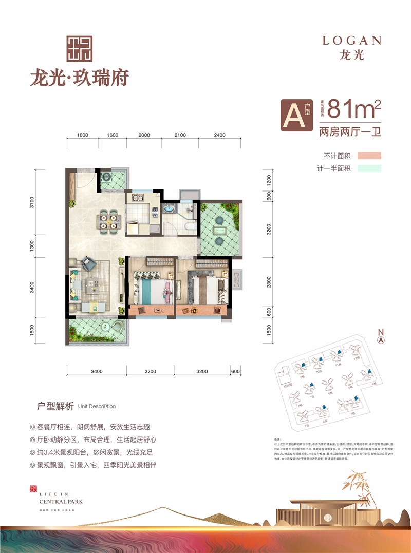 卖点七:一园玖境,尽揽盛景匠心打造瞰景园林景观,将草木花石完美融合,同时社区规划环形跑道、亲水泳池、羽毛球场、儿童乐园,长者休闲空间等设施,营造多维社区休闲场景,满足各年龄段业主生活所需。