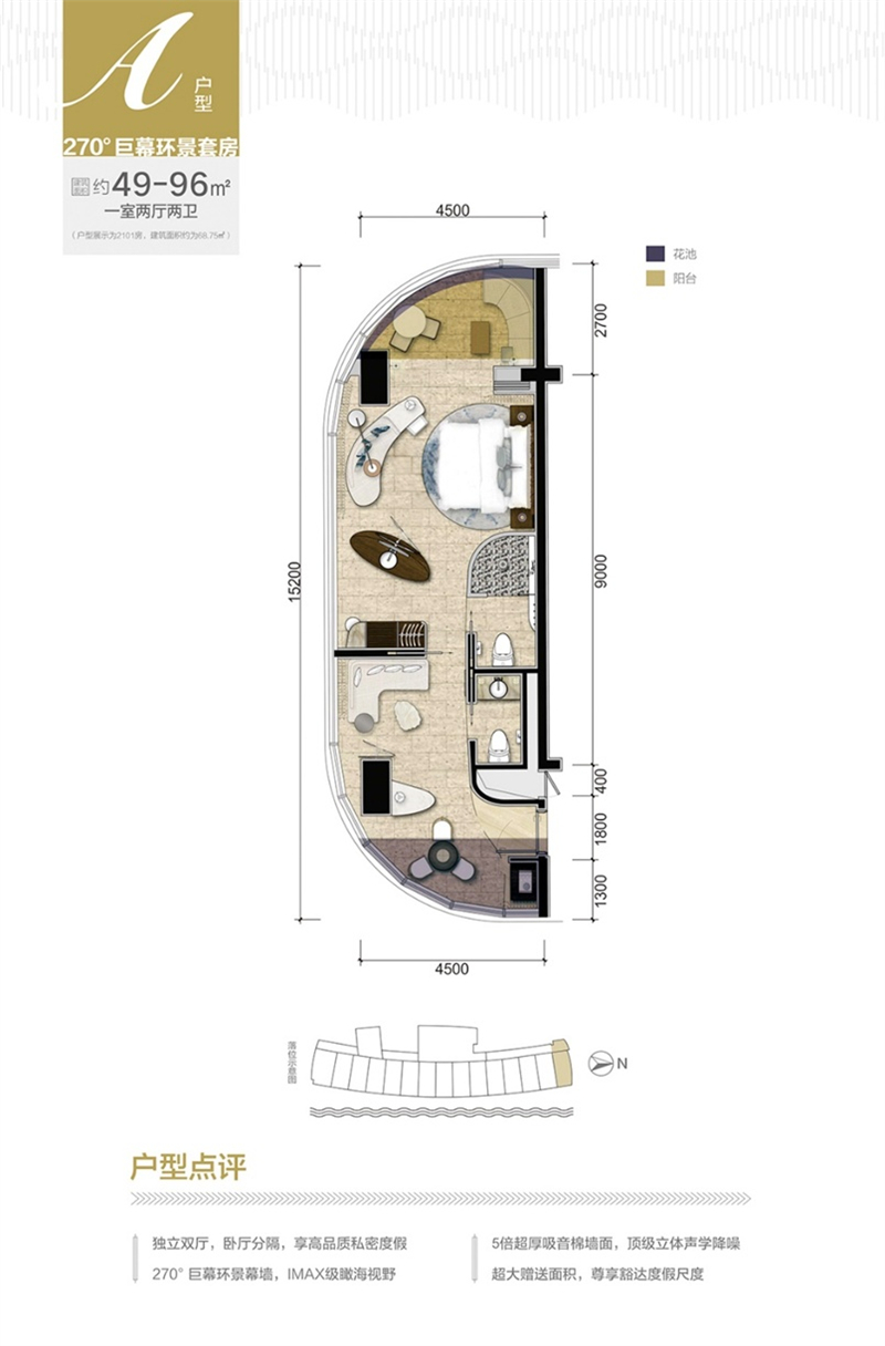 【A户型 270°巨幕环景套房】建筑面积 约49-96㎡ 一室两厅两卫独立双厅,卧厅分隔,享高品质私密度假;270°巨幕环景幕墙,IMAX级瞰海视野;5倍超厚吸音棉墙面,顶级立体声学降噪;超大赠送面积,尊享豁达度假尺度。
