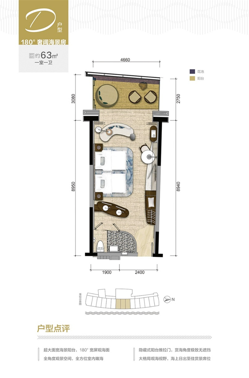 【D户型 180°奢阔海景房】建筑面积 约63㎡ 一室一卫 超大面宽海景阳台,180°宽屏观海面全角度观景空间,全方位室内瞰海隐藏式阳台推拉门,赏海角度极致无遮挡;东向开间直面太平洋,海上日出至佳赏景席位。