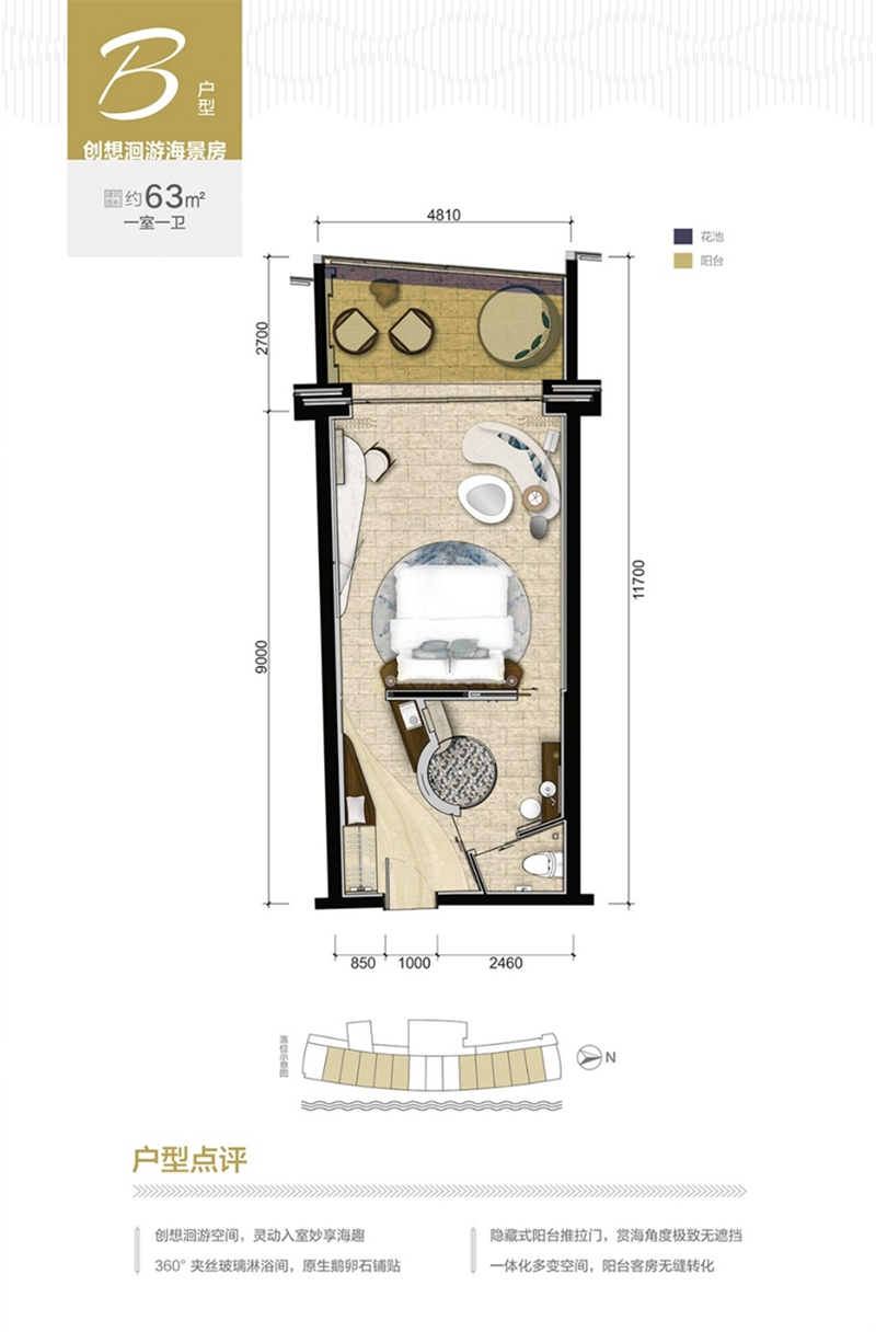 【B户型 创想洄游海景房】建筑面积 约63㎡ 一室一卫创想洄游空间,灵动入室妙享海趣;360°夹丝玻璃淋浴间,原生鹅卵石铺贴;隐藏式阳台推拉门,赏海角度极致无遮挡;一体化多变空间,阳台客房无缝转化。