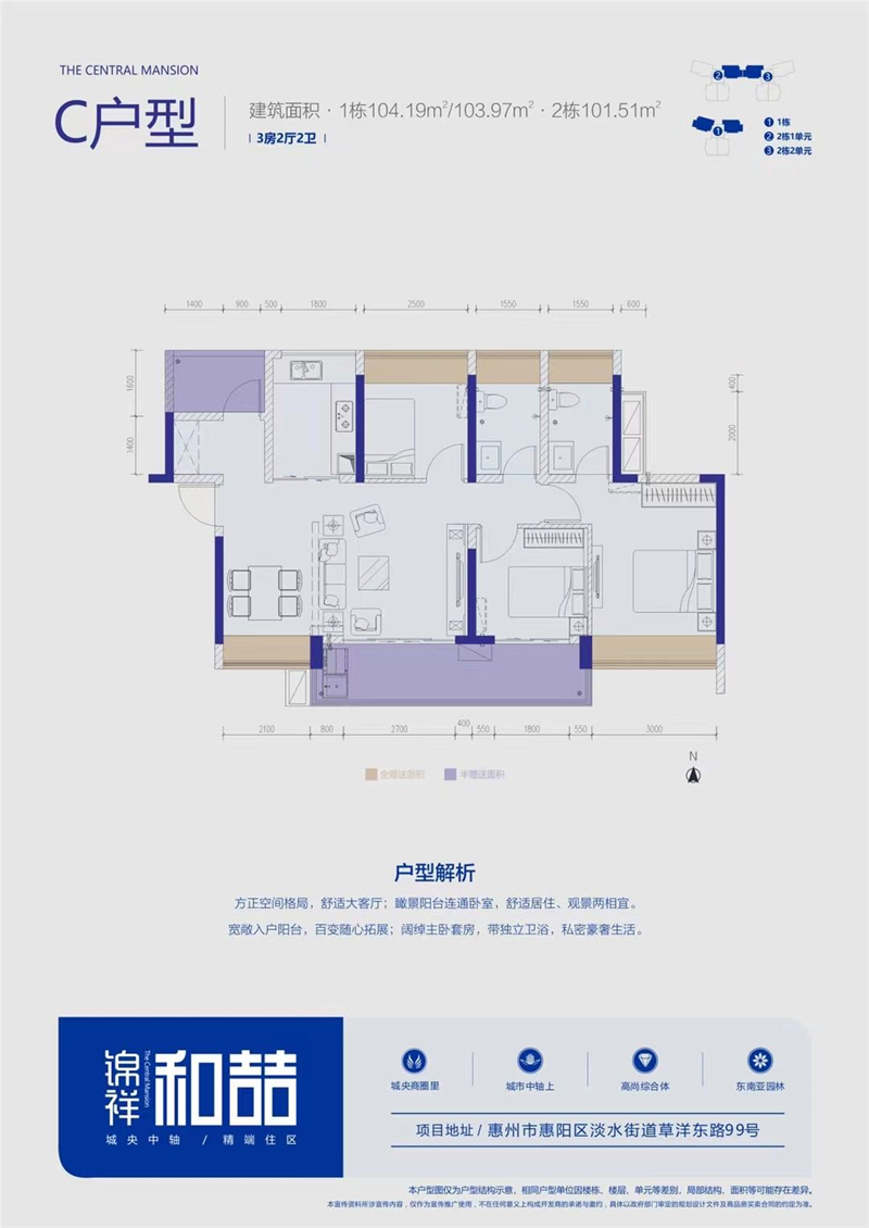 C户型 建面101.51㎡-104.19㎡三房两厅两卫