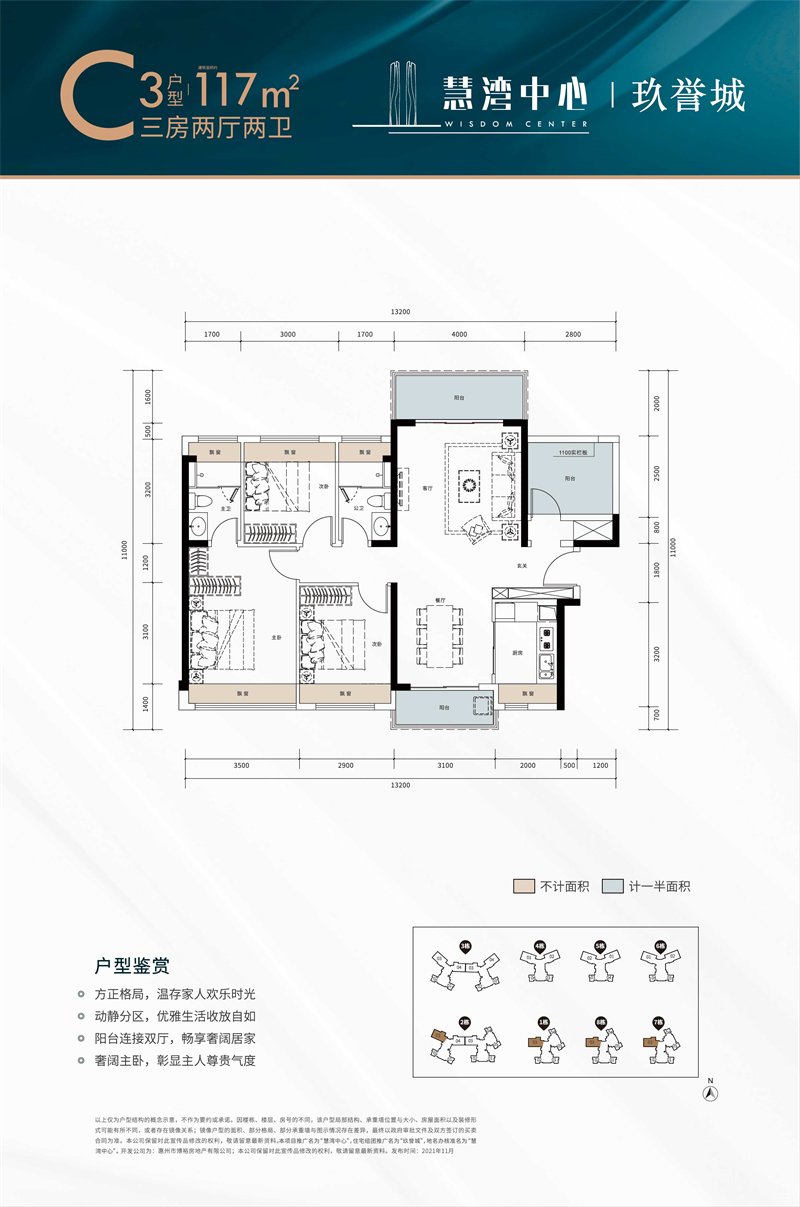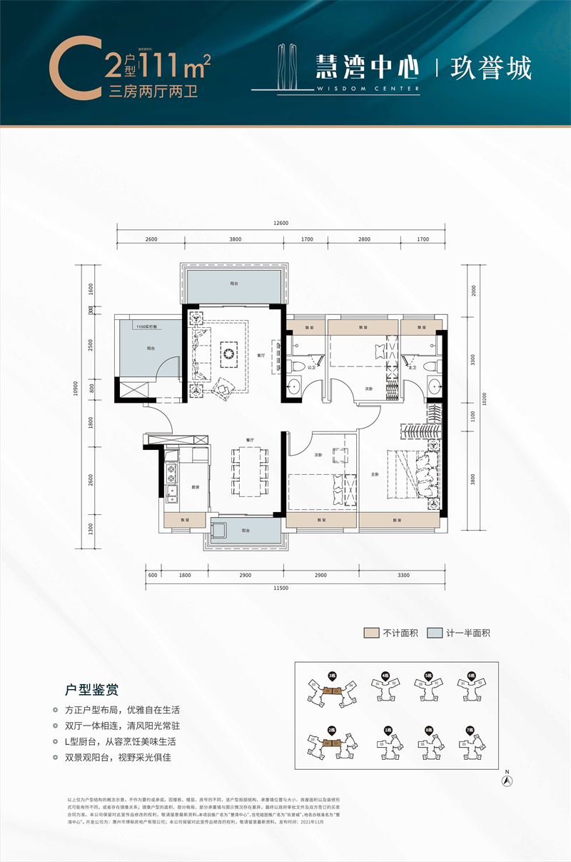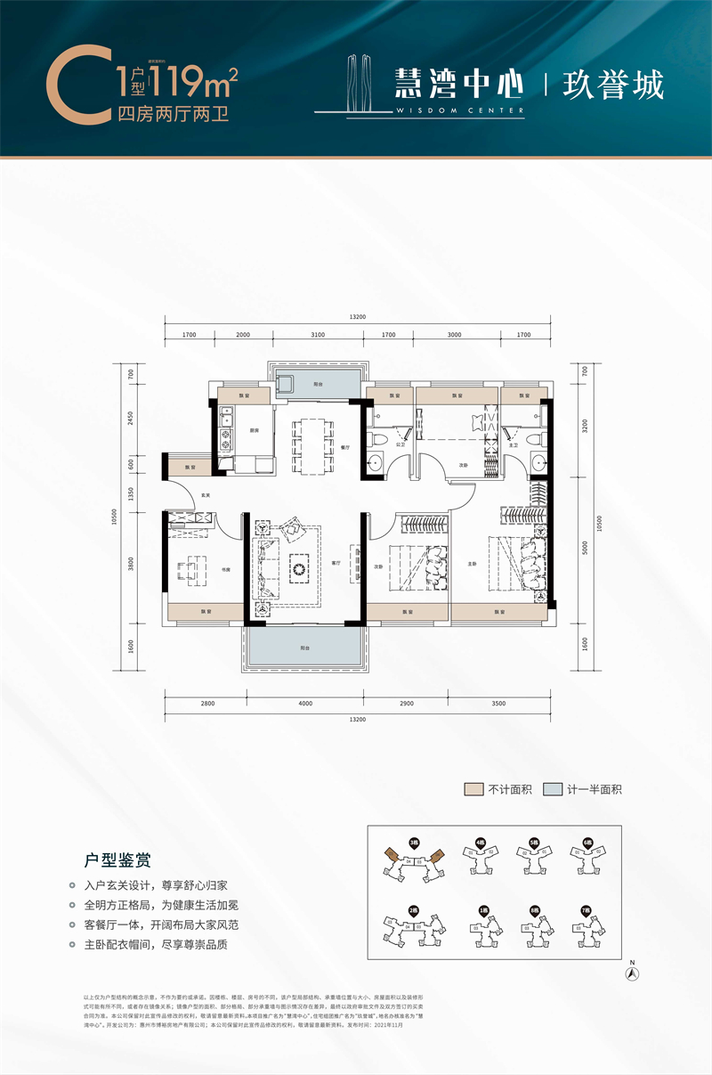 建面约111-119㎡阔景三至四房方正户型格局,双厅一体相连;动静分区,畅享奢阔居家;户型南北通透,俯瞰园区中轴景观;全明采光,连通布局景观阳台,独立书房