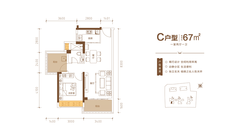 户型:67㎡精致1+1刚需实用户型,动静分区,搭配玄关设计。