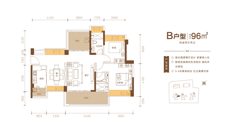 户型:96㎡改善舒适户型,横厅设计,5.4景观阳台,南北通透。