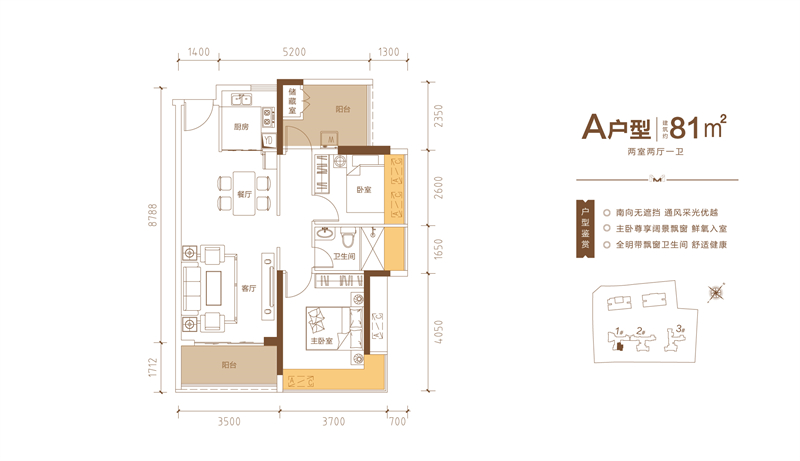 A户型:81㎡刚需2+1实用户型,南向无遮挡阳台,270°主卧飘窗。