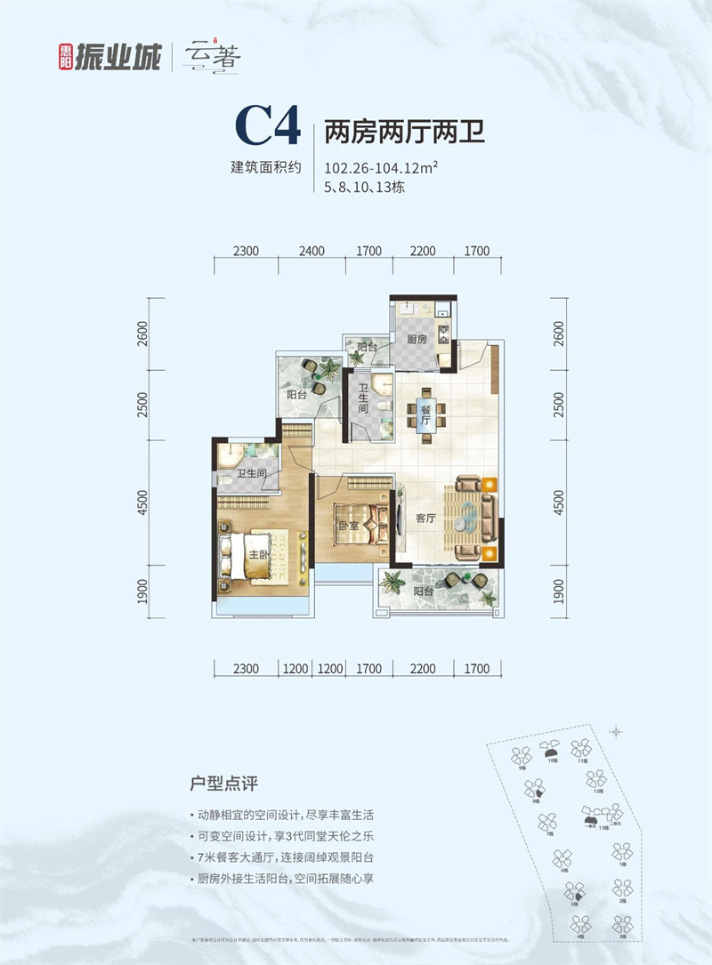C4户型:102-104㎡两房两厅两卫动静分区空间,灵动空间设计约7客餐厅,独立生活阳台