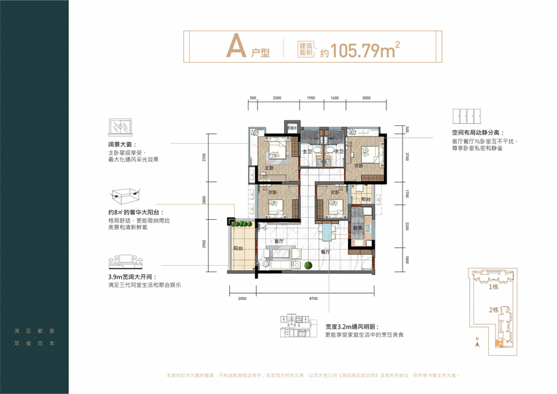 四、户型图A户型105㎡ :南向4房,双阳台设计