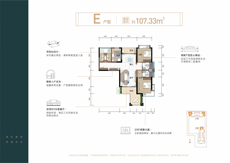 E户型:107.33㎡:通透4房,三面采光
