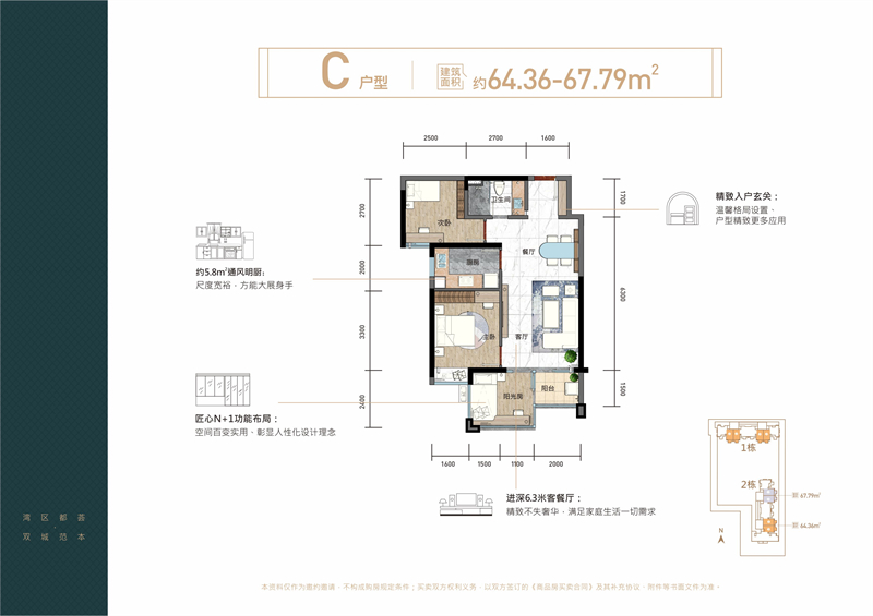 C户型:64.36-67.79㎡,3房产品,超高实用率
